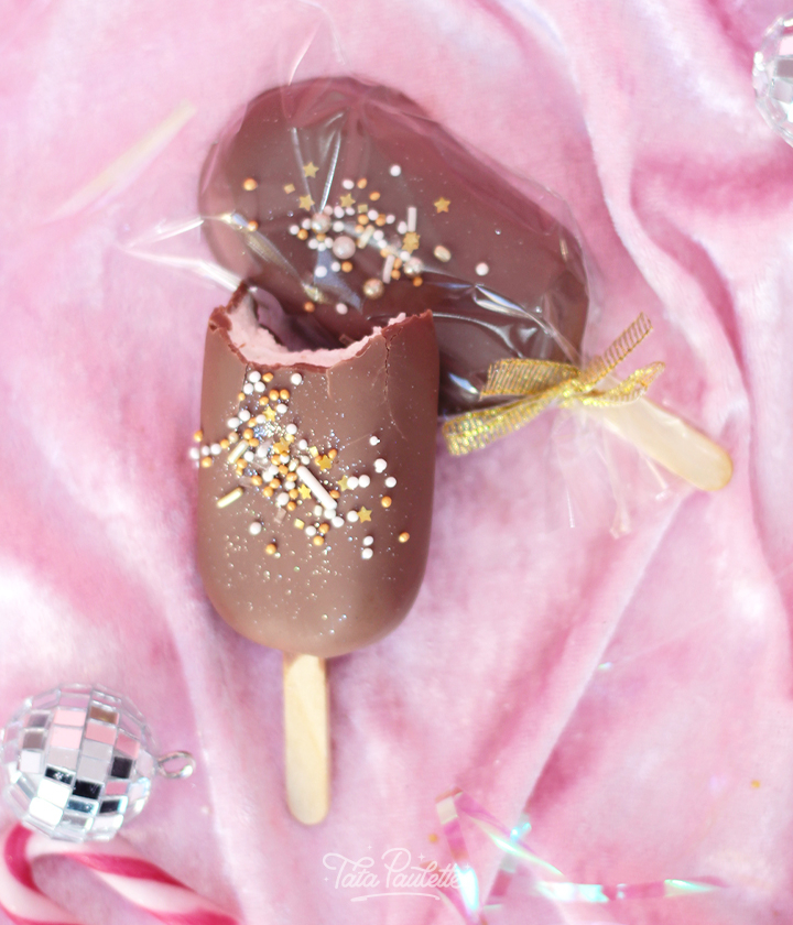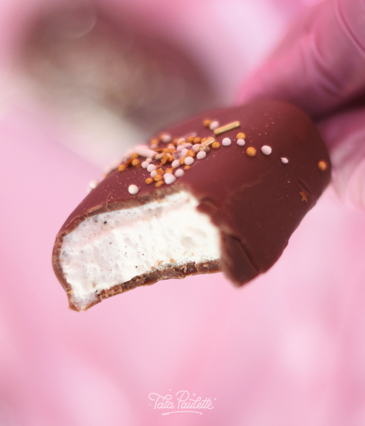 Notre esquimaux est recouvert d'une couche gourmande de chocolat au lait Cacao Barry, fourrée de guimauves à la vanille de Madagascar et décorée aux couleurs de Noël.
