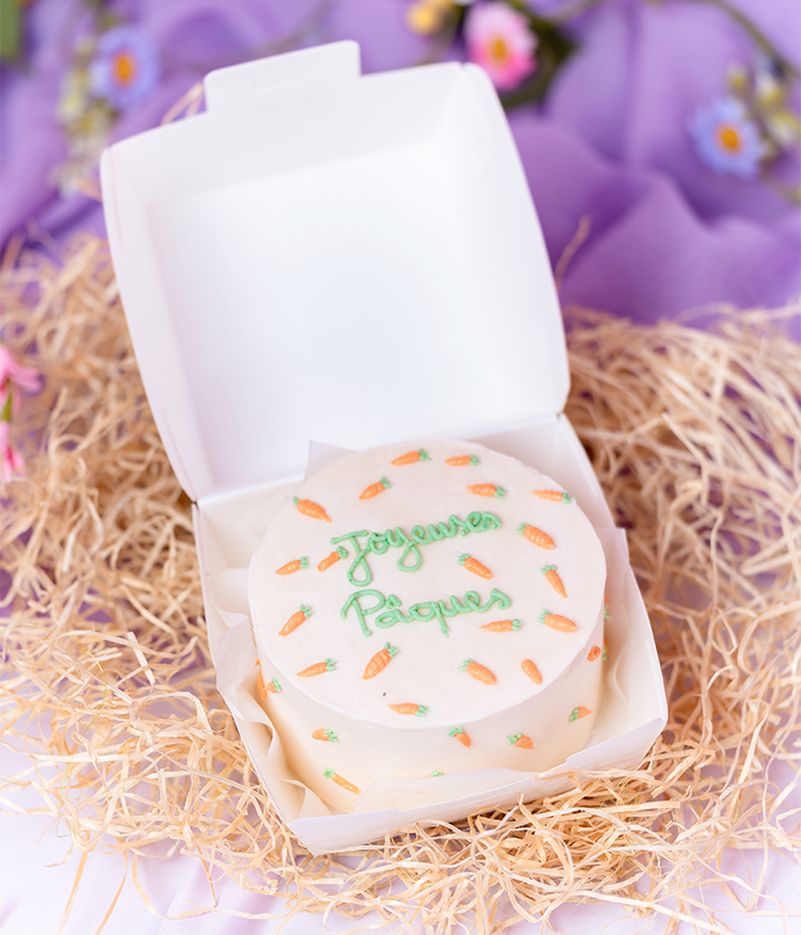 Le mini gâteau qui fait craquer Instagram… et encore plus quand on le mange. Un bento cake de Pâques pour 2 personnes, décoré avec ses mini carottes et personnalisable avec le mot de votre choix.