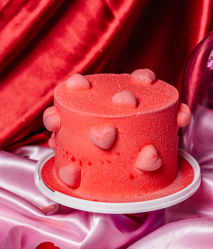 Le Rétro cake Saint-Valentin façon framboisier, au glaçage rouge mat et décoré de cœurs en relief.
