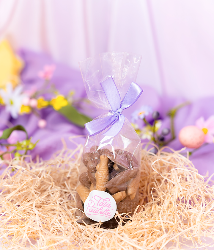 Les fritures de Pâques, version Tata Paulette : un mix de petits chocolats noir, lait et dulcey à picorer pendant la chasse aux œufs, à glisser dans un panier cadeau ou à poser sur la table pour les gourmands qui passent par là.